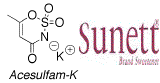 The structurally similar acesulfam-K, known in the trade as Sunett™ or Sweet-One™, is approximately 200 times as sweet as sugar. Acesulfam-K is also flawed by a slight metallic after-taste in high concentrations. A great advantage of acesulfam-K is its stability under heating, which allows it to be used in backing or to sweeten warm drinks.